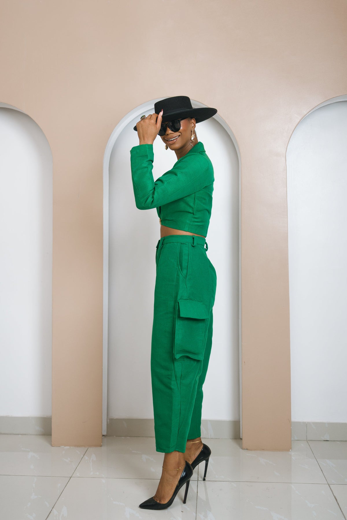 The cropped jacket features a shawl collar, long sleeves, and an open-front design, blending sophistication with effortless charm. The high-waisted barrel pants bring structure and flair, finished with cargo-style flap pockets, belt loops, and a cropped hem that accentuates the silhouette.