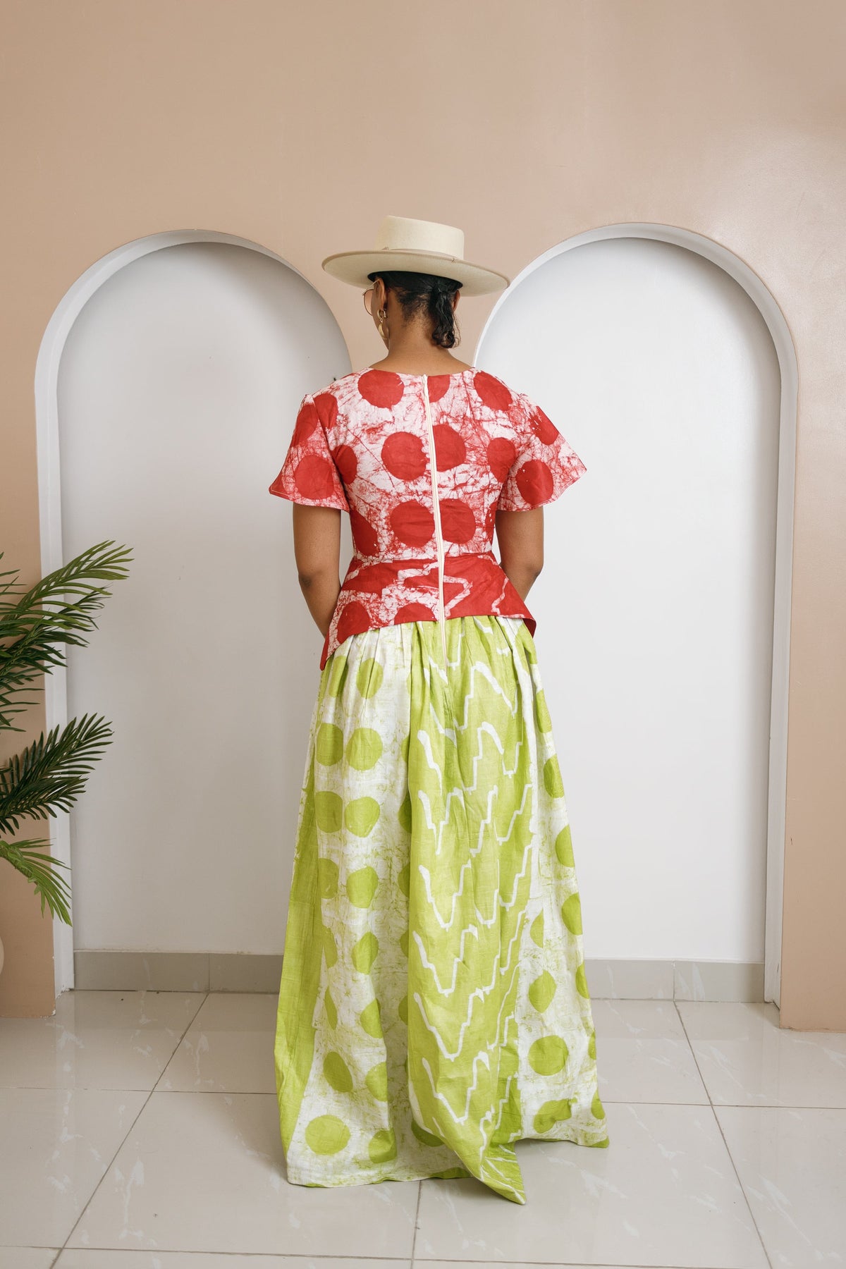 The tiered silhouette creates a soft, voluminous flow, while the flutter sleeves with center slits add movement and charm. Lightweight yet full of presence, it’s perfect for cultural celebrations, relaxed outings, or resort wear.