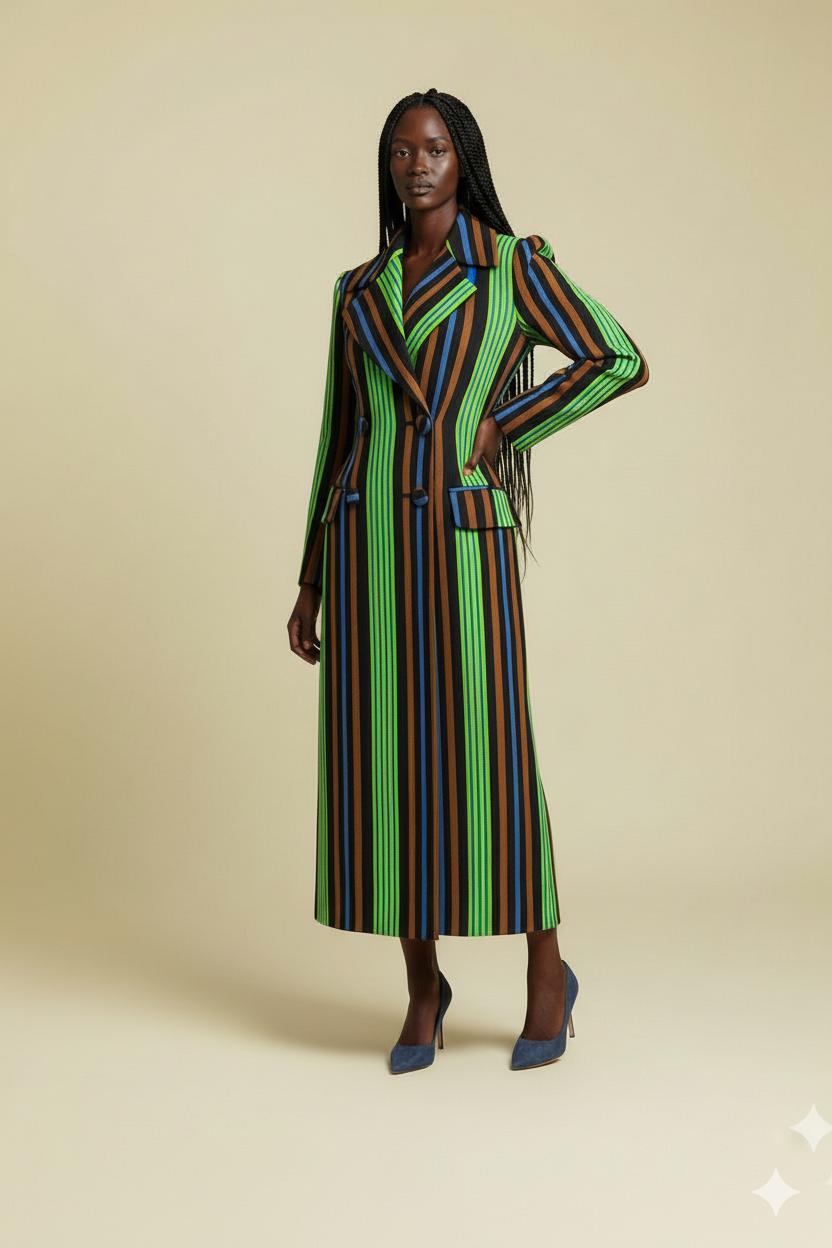 The Omenka Coat redefines sophistication with a perfect balance of French tailoring and African craftsmanship. Designed in the U.S. and hand-crafted in Africa, this masterpiece is made from luxurious Aso Oke fabric, showcasing vibrant stripes in bold, refined hues.