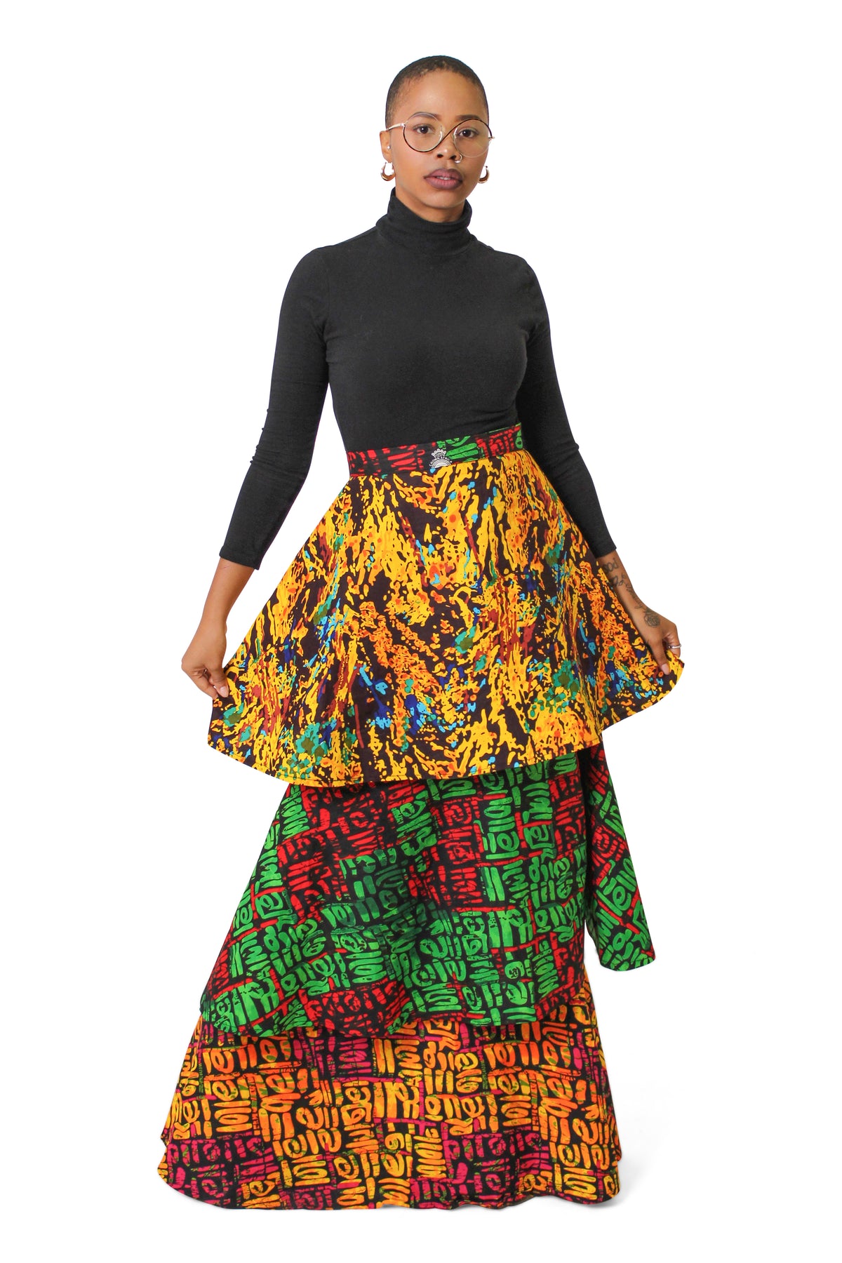 Model wearing colorful triple-layered Ankara maxi skirt with vibrant multicolor prints