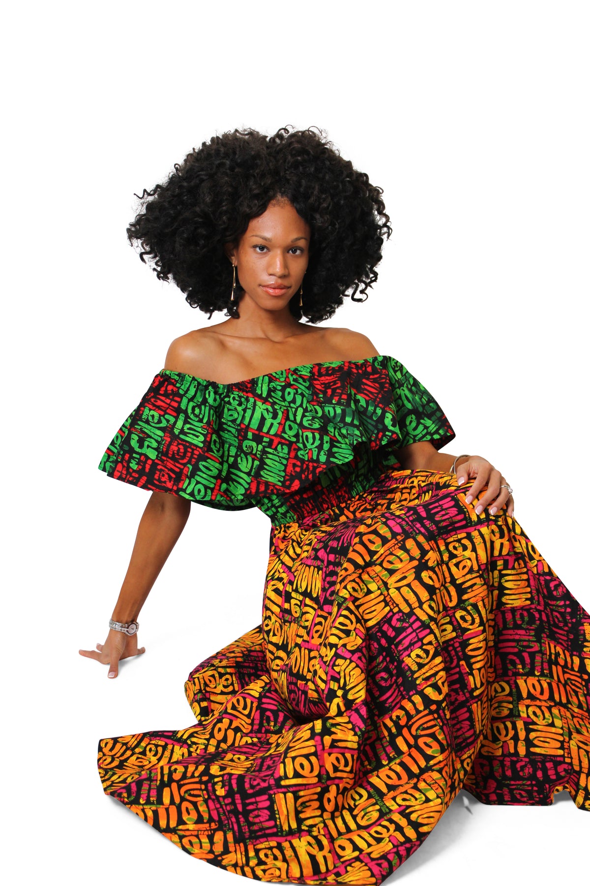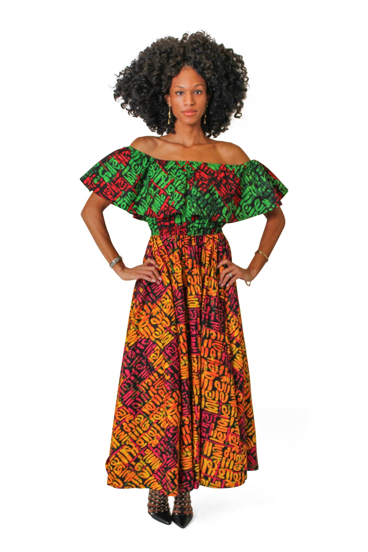 Woman wearing the Ebube Ruffle Latin One-Piece Dress, a colorful off-shoulder African Ankara maxi dress with ruffle neckline.