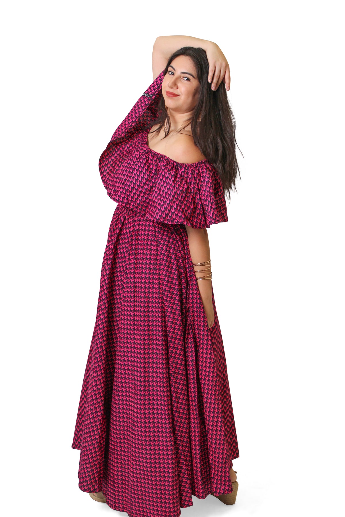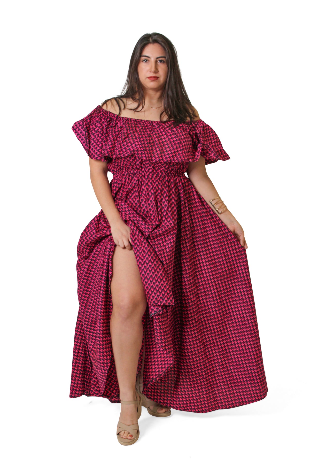 Introducing Nchedo, a stunning off-shoulder maxi dress crafted for elegance, comfort, and cultural expression. Featuring a bold geometric African print, a flattering elasticated neckline, and a dramatic front slit, this one-piece dress flows beautifully with every step.