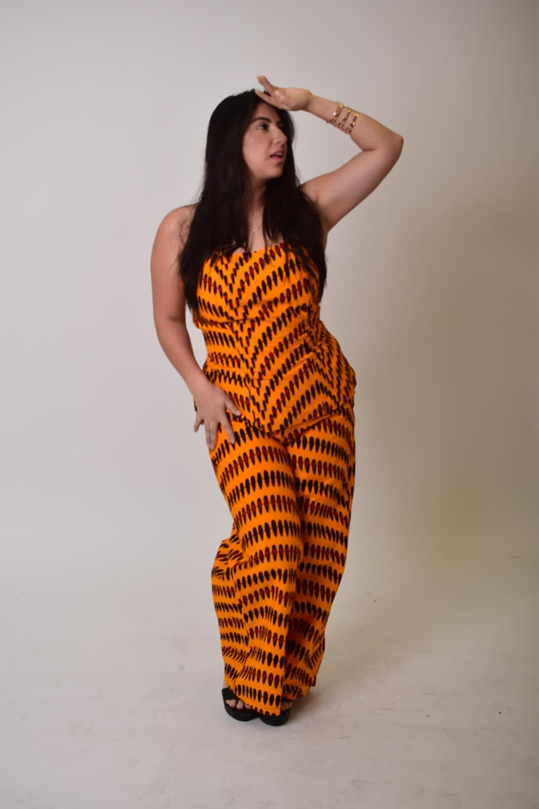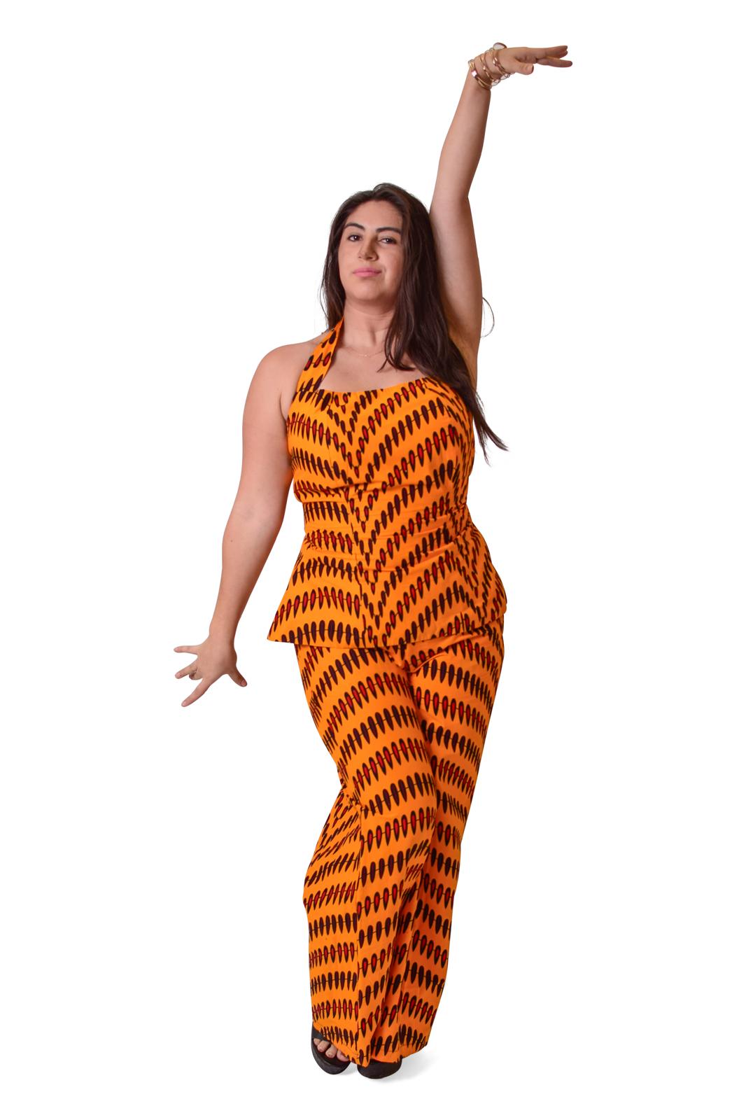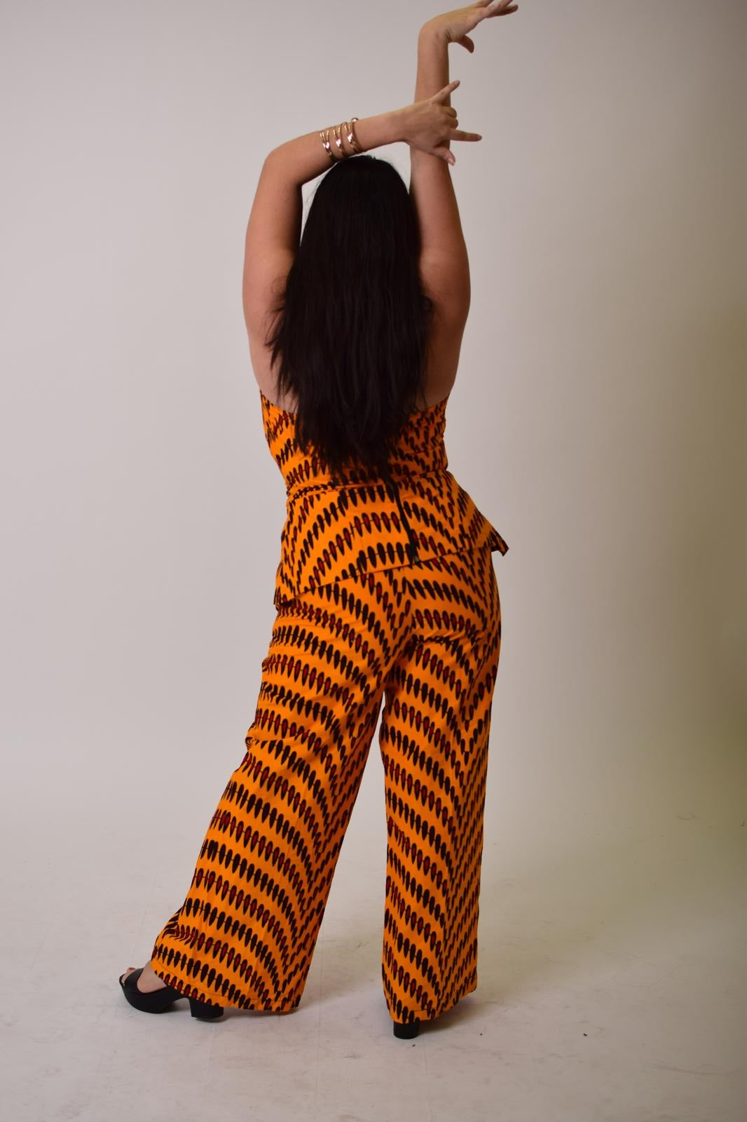 Step into confidence and royalty with Oba, a beautifully tailored halter-neck peplum top and matching wide-leg pants set crafted from premium Ankara cotton. Designed in the U.S. and hand-crafted in Africa, this vibrant two-piece outfit delivers structure, comfort, and unmistakable style.