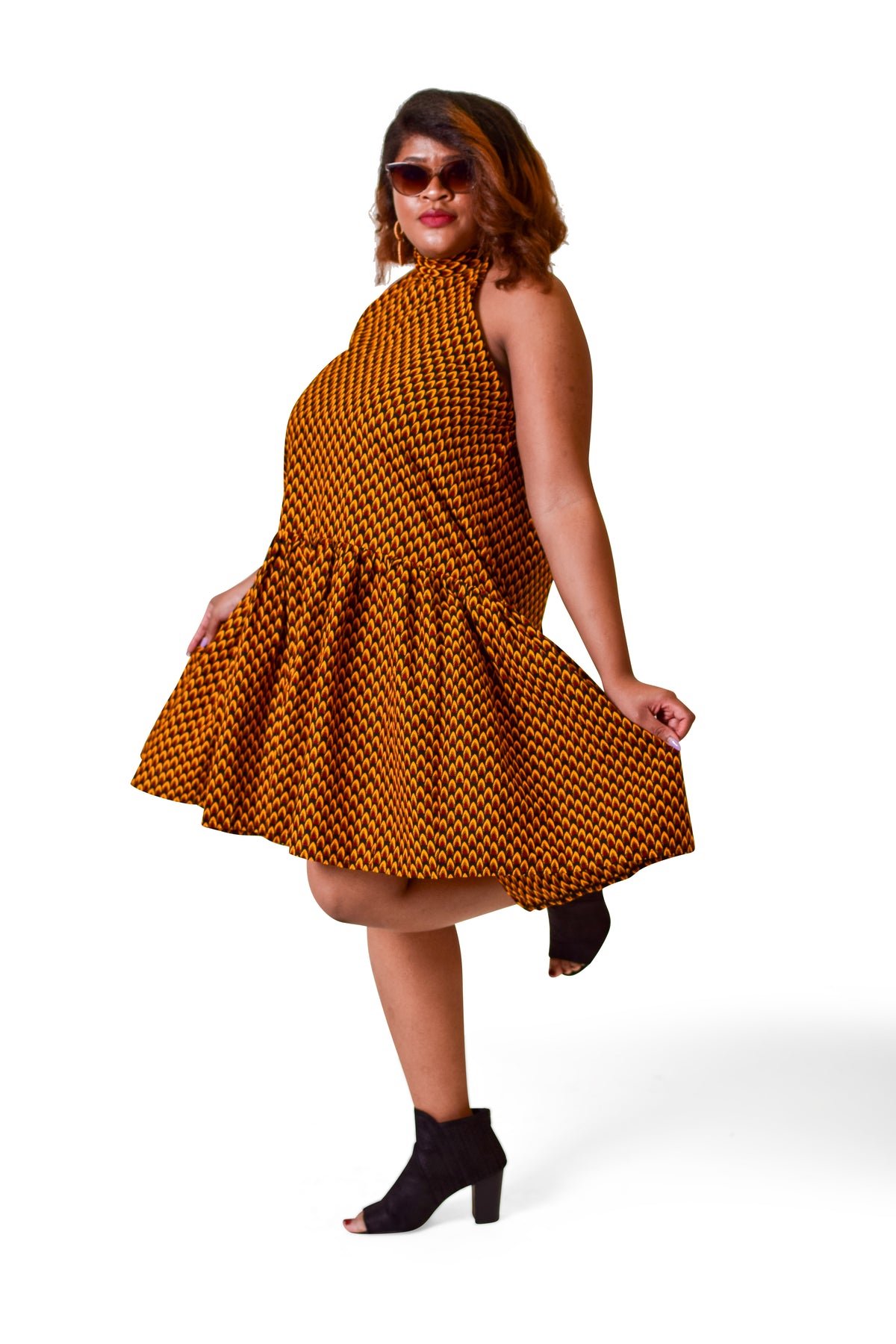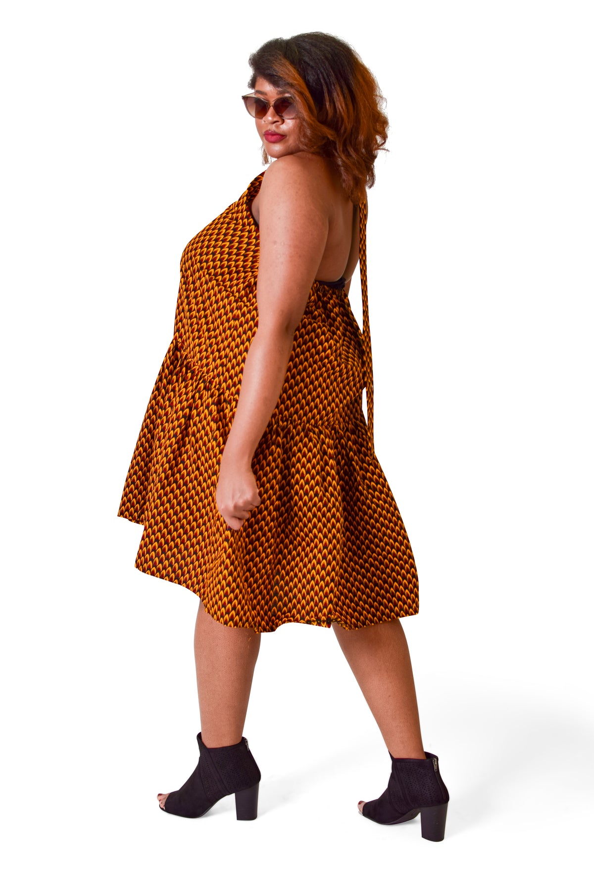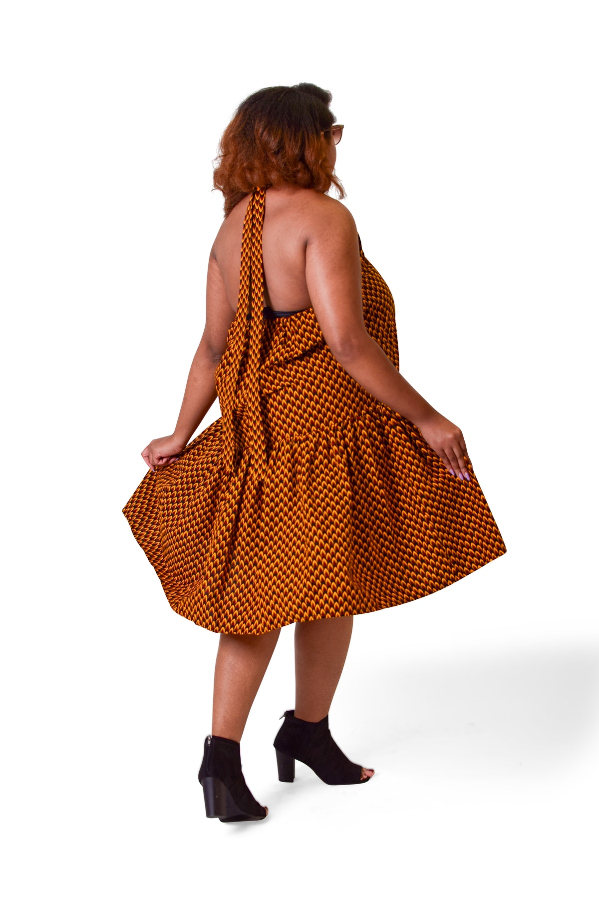 Bold, playful, and effortlessly chic, Tuffia is a halter-neck fit-and-flare dress crafted from premium Ankara cotton fabric. Designed to move with ease, this knee-length silhouette flatters the waist while offering comfort and confident style.